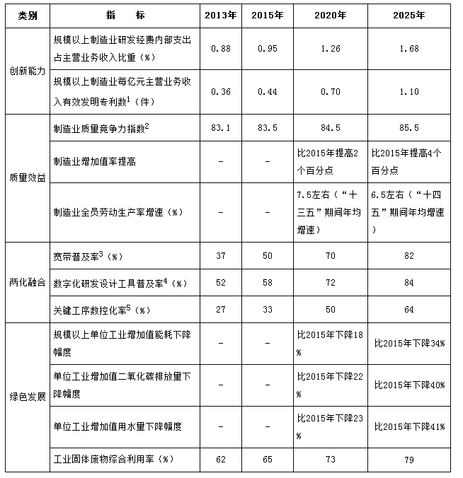 到2025年,制造業(yè)整體素質(zhì)大幅提升,創(chuàng)新能力顯著增強,全員勞動生產(chǎn)率明顯提高,兩化(工業(yè)化和信息化)融合邁上新臺階。重點行業(yè)單位工業(yè)增加值能耗、物耗及污染物排放達到世界先進水平。形成一批具有較強國際競爭力的跨國公司和產(chǎn)業(yè)集群,在全球產(chǎn)業(yè)分工和價值鏈中的地位明顯提升。