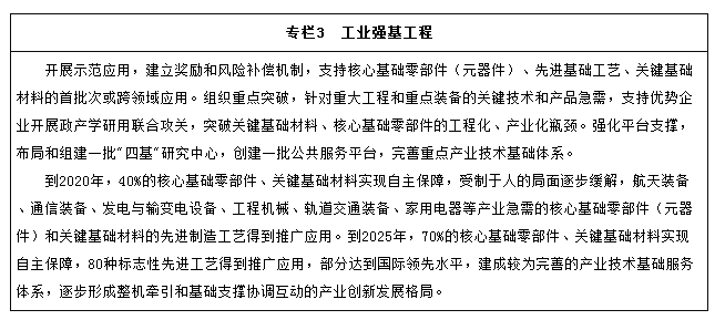 核心基礎(chǔ)零部件(元器件)、先進基礎(chǔ)工藝、關(guān)鍵基礎(chǔ)材料和產(chǎn)業(yè)技術(shù)基礎(chǔ)(以下統(tǒng)稱“四基”)等工業(yè)基礎(chǔ)能力薄弱,是制約我國制造業(yè)創(chuàng)新發(fā)展和質(zhì)量提升的癥結(jié)所在。要堅持問題導(dǎo)向、產(chǎn)需結(jié)合、協(xié)同創(chuàng)新、重點突破的原則,著力破解制約重點產(chǎn)業(yè)發(fā)展的瓶頸。