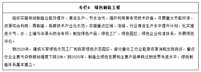 加大先進節(jié)能環(huán)保技術(shù)、工藝和裝備的研發(fā)力度,加快制造業(yè)綠色改造升級;積極推行低碳化、循環(huán)化和集約化,提高制造業(yè)資源利用效率;強化產(chǎn)品全生命周期綠色管理,努力構(gòu)建高效、清潔、低碳、循環(huán)的綠色制造體系。