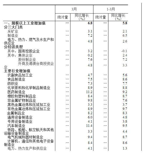 分經(jīng)濟(jì)類(lèi)型看,3月份,國(guó)有控股企業(yè)增加值同比增長(zhǎng)3.2%;集體企業(yè)增長(zhǎng)0.2%,股份制企業(yè)增長(zhǎng)7.6%,外商及港澳臺(tái)商投資企業(yè)增長(zhǎng)4.8%。