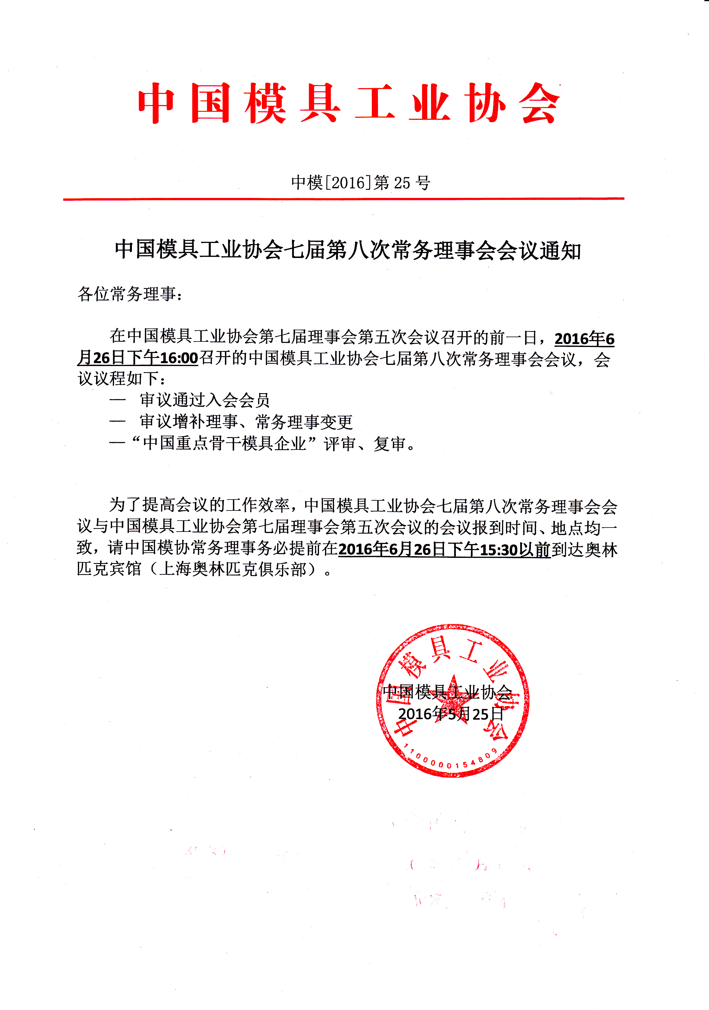 中國模具工業(yè)協(xié)會七屆第八次常務(wù)理事會會議通知