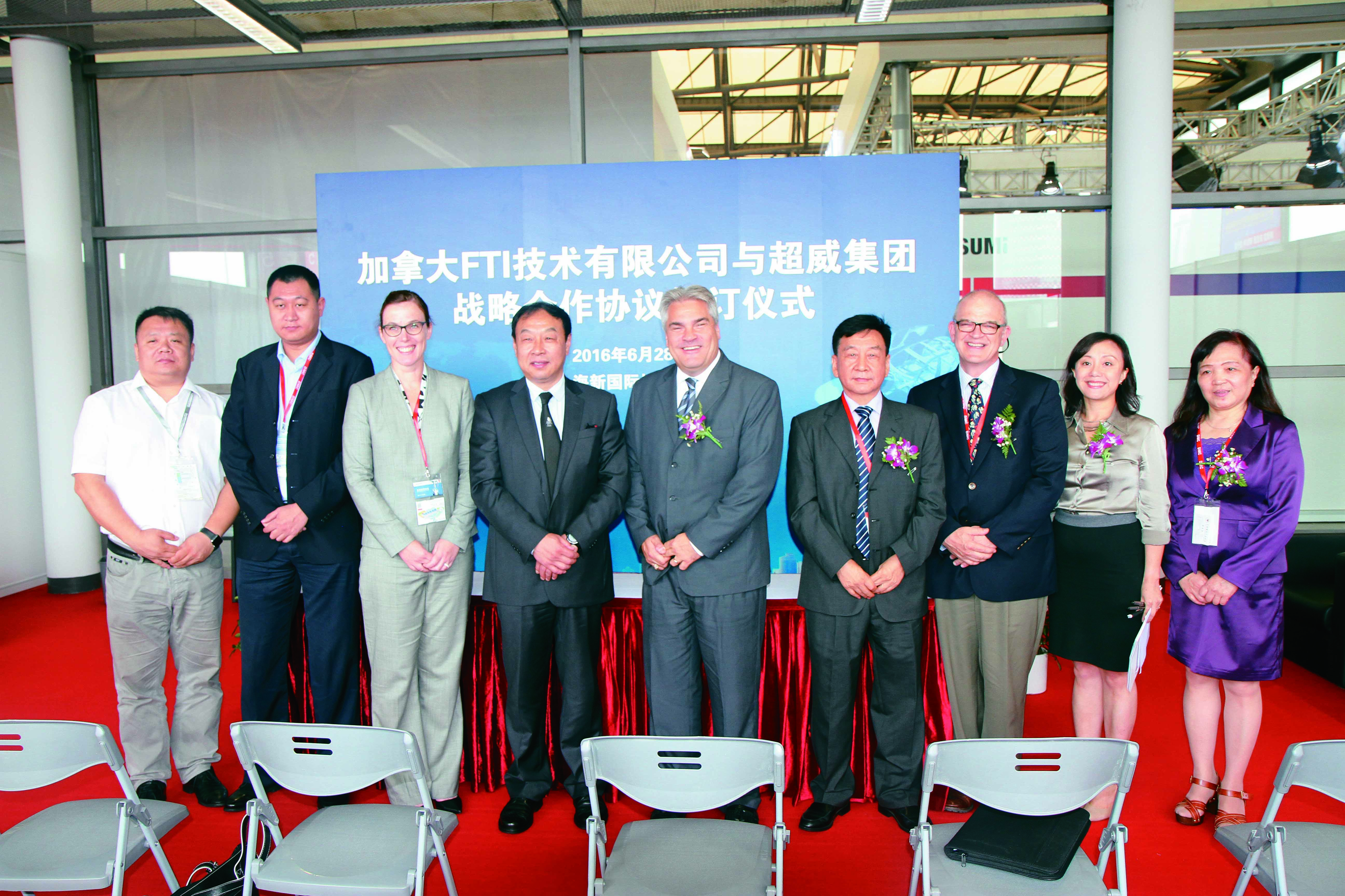 2016 年6 月28 日,DMC2016 展會拉開了序幕,在此次展會上加拿大F T I 技術有限公司與超威集團簽訂戰(zhàn)略合作協(xié)議,中國模具工業(yè)協(xié)會常務副會長兼秘書長武兵書先生、中國模具工業(yè)協(xié)會副秘書長李玉華女生、浙江普朗特電動汽車有限公司C EO 王國富先生、加拿大F T I 技術有限公司CEO Michael Gallagher 先生、加拿大駐上海領事兼商務專員Katrin Spence 女士出席了本次簽約儀式。