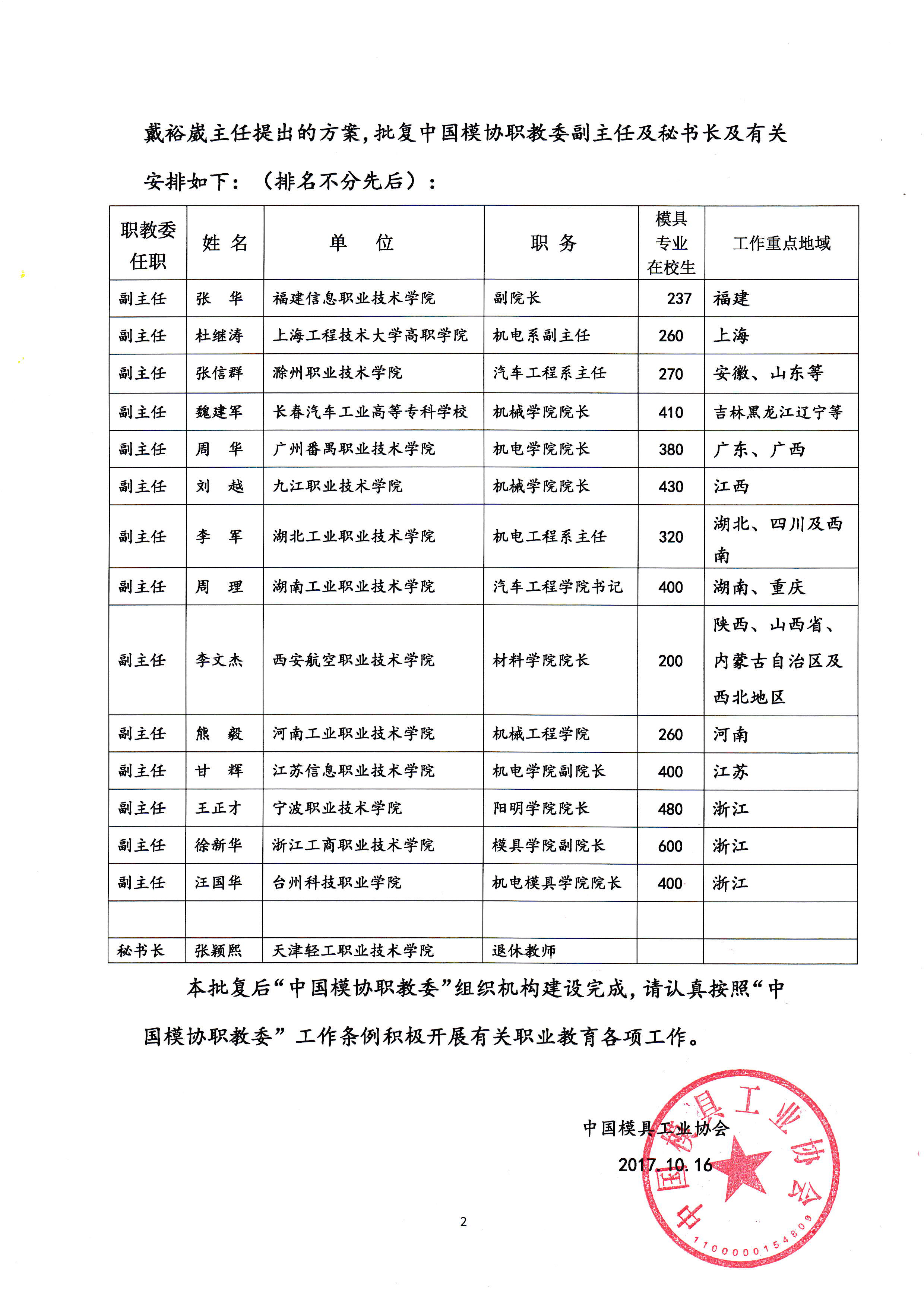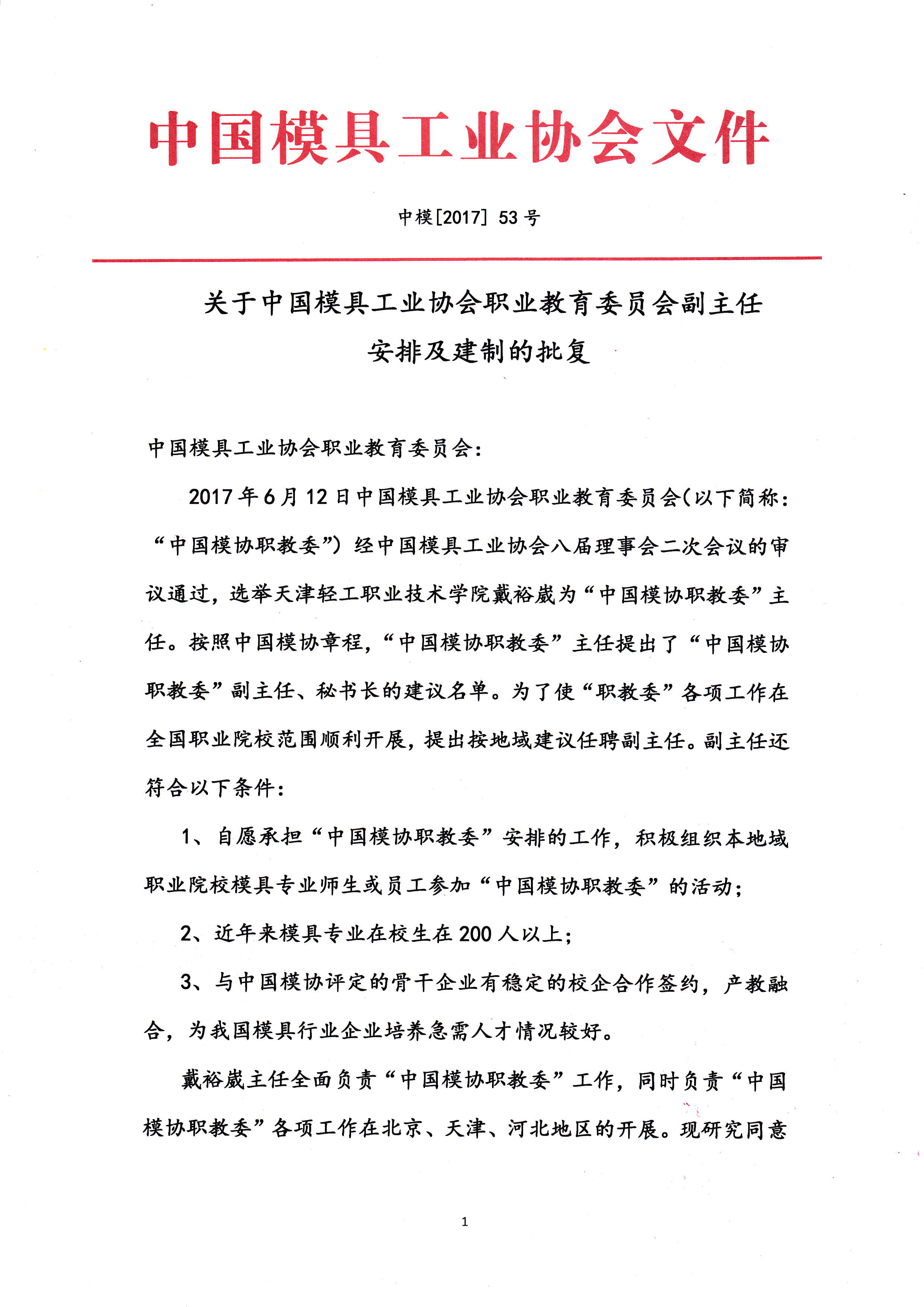 關于中國模具工業(yè)協(xié)會職業(yè)教育委員會副主任安排及建制的批復