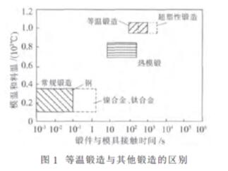 等溫鍛造指毛坯從始鍛到終鍛始終在同一溫度條件下進行低變形速率的鍛造。等溫鍛造( Iso thermal forging) 成形時,毛坯與模具的加熱溫度相同, 并且應變速率很低(10-4-10-2s-1), 這樣由于消除了模具激冷和材料應變硬化的影響,不僅變形抗力小,而且可以完成凈成形(near-net-shape) 加工,因而大大提高了金屬的利用率以及鍛件的性能。這種新型工藝已經成為先進難變形材料( 如鈦合金、鎳基高溫合金、金屬間化合物) 的主要成形方法,其與其他鍛造的區別如圖1所示。