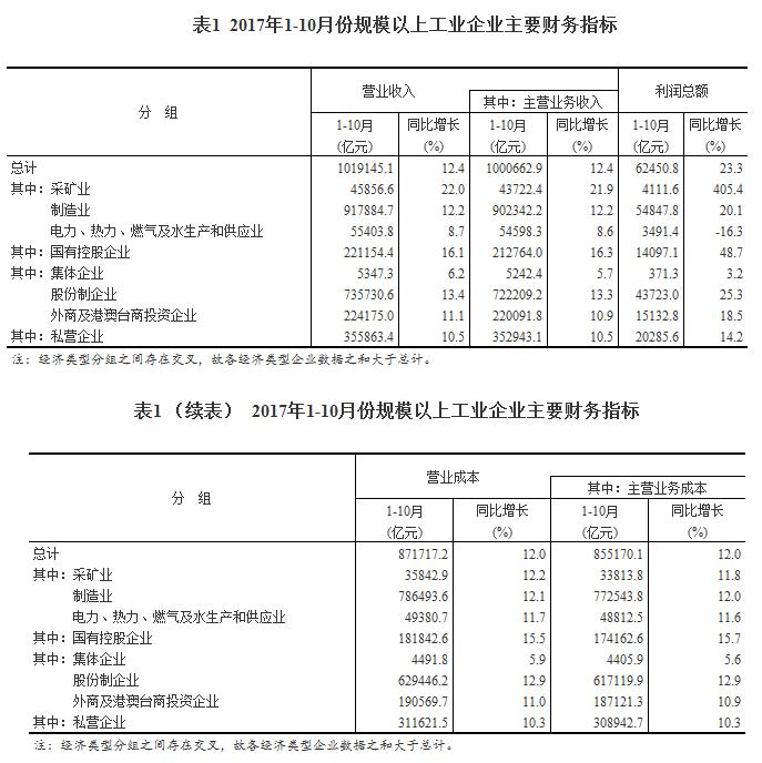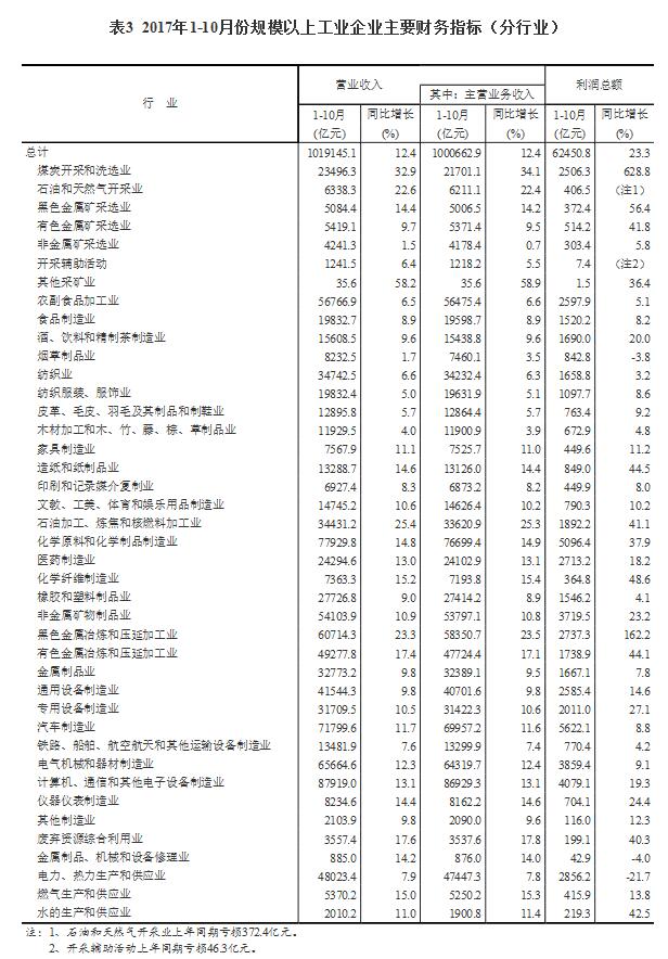 1-10月份,全國規(guī)模以上工業(yè)企業(yè)實現(xiàn)利潤總額62450.8億元,同比增長23.3%,增速比1-9月份加快0.5個百分點。