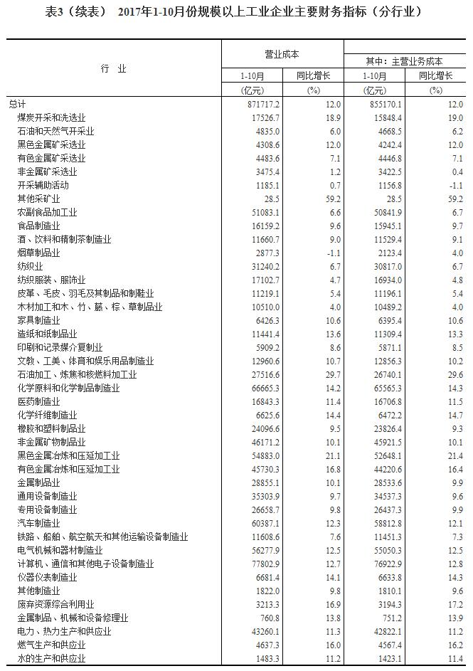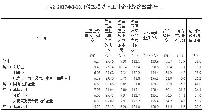 1-10月份,規(guī)模以上工業(yè)企業(yè)實現(xiàn)主營業(yè)務(wù)收入100.1萬億元,同比增長12.4%;發(fā)生主營業(yè)務(wù)成本85.5萬億元,增長12%;主營業(yè)務(wù)收入利潤率為6.24%,同比提高0.55個百分點。