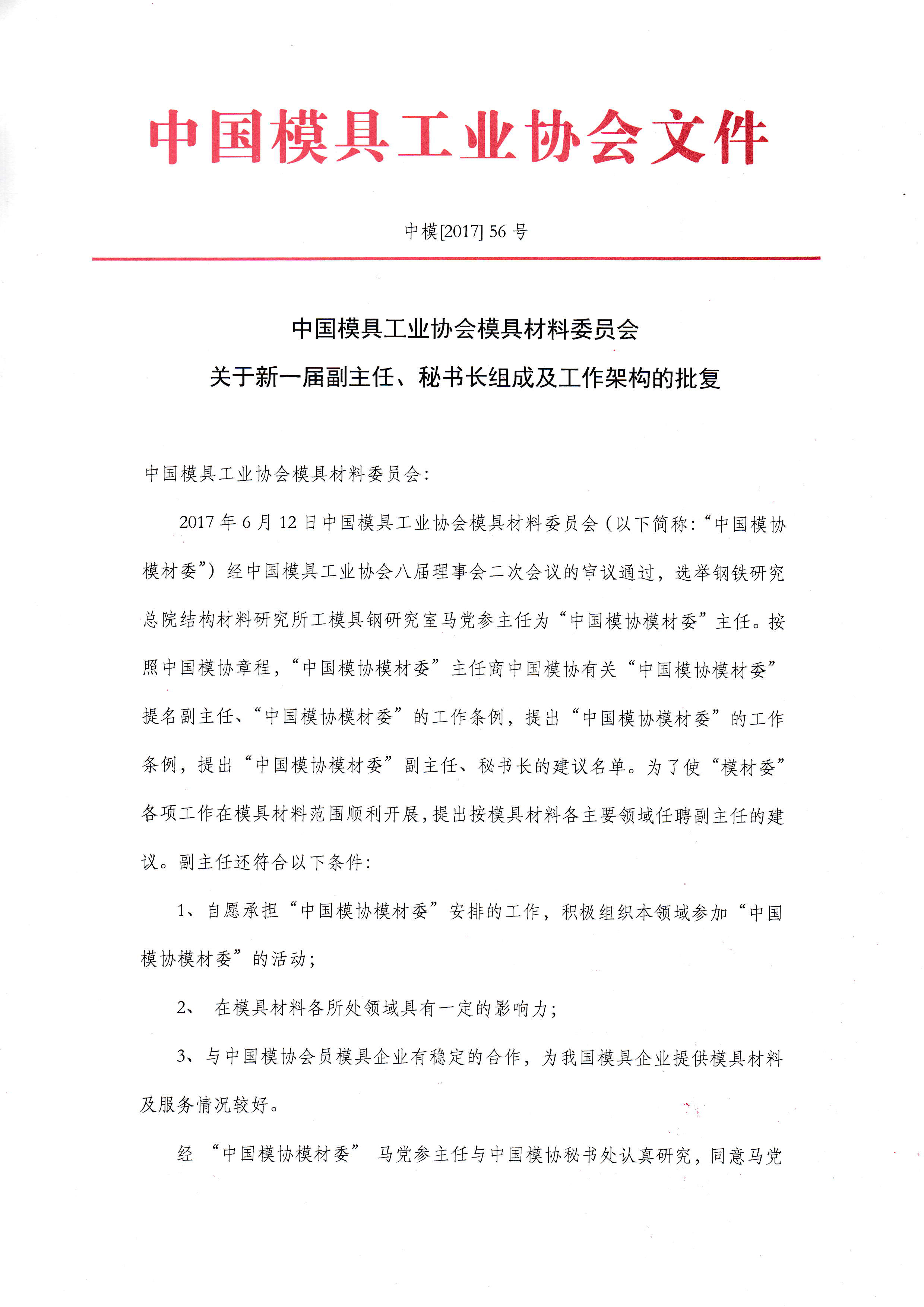 模具材料委員會(huì)關(guān)于新一屆副主任、秘書(shū)長(zhǎng)組成及工作架構(gòu)的批復(fù)