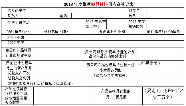 現代模具工業是高技術背景下的資金和技術密集型工業。隨著模具行業的發展,現代模具要實現數字化設計、數字化制造、數字化管理、數字化生產流程來實現模具工業的現代化。模具材料是降本提質增效的重要至關領域,為了服務模具企業提高模具材料使用,提升使用的能力, 第十八屆中國國際模具技術和設備展覽會主辦單位之一的中國模具工業協會十分注重展覽會的內涵,在歷屆展覽會上均開展了對展覽會展品的評述工作,至今已成定式。為了更好地為模具企業提供多元的服務,為企業的模具制造加工解決方案提供保障,進一步推動模具及模具相關行業交流與互動,在第十八屆中國國際模具技術和設備展覽會期間,中國模具工業協會委托中國模具工業協會模具材料委員會,本著自愿的原則,依據供應商裝備水平,在模具行業服務水平、市場占有率的高低、對模具行業服務滿意等行業貢獻指標,并結合模具企業的意見開展評定優秀模具材料供應商活動,活動不收取參評單位任何費用。現將優秀模具材料供應商登記表發給你們,請予認真填寫,盡快返回中國模具工業協會模具材料委員會 遲宏宵 收。