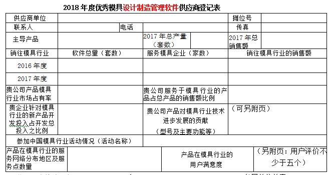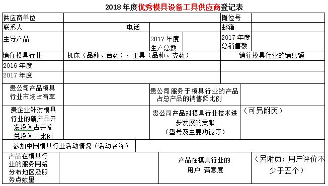 現代模具工業是高技術背景下的資金和技術密集型工業。隨著模具行業的發展,現代模具要實現數字化設計、數字化制造、數字化管理、數字化生產流程來實現模具工業的現代化。第十八屆中國國際模具技術和設備展覽會主辦單位之一的中國模具工業協會十分注重展覽會內涵,在歷屆展覽會上均開展了對展覽會展品的評述工作,至今已成定式。為了更好地為模具企業提供多元服務,為企業的模具設計、加工解決方案提供保障,進一步推動模具及模具相關行業交流與互動,在第十八屆中國國際模具技術和設備展覽會期間,中國模具工業協會委托中國模具工業協會裝備委員會承擔優秀模具制造設備供應商評定工作。將本著自愿的原則,依據供應商裝備水平,在模具行業服務水平、市場占有率的高低、對模具行業服務滿意等行業貢獻指標,并結合模具企業的意見開展評定優秀模具制造設備工具供應商,活動不收取參評單位任何費用。現將優秀模具制造設備供應商登記表發給你們,請認真填寫,盡快返回中國模具工業協會裝備委員會王曉娟 收。