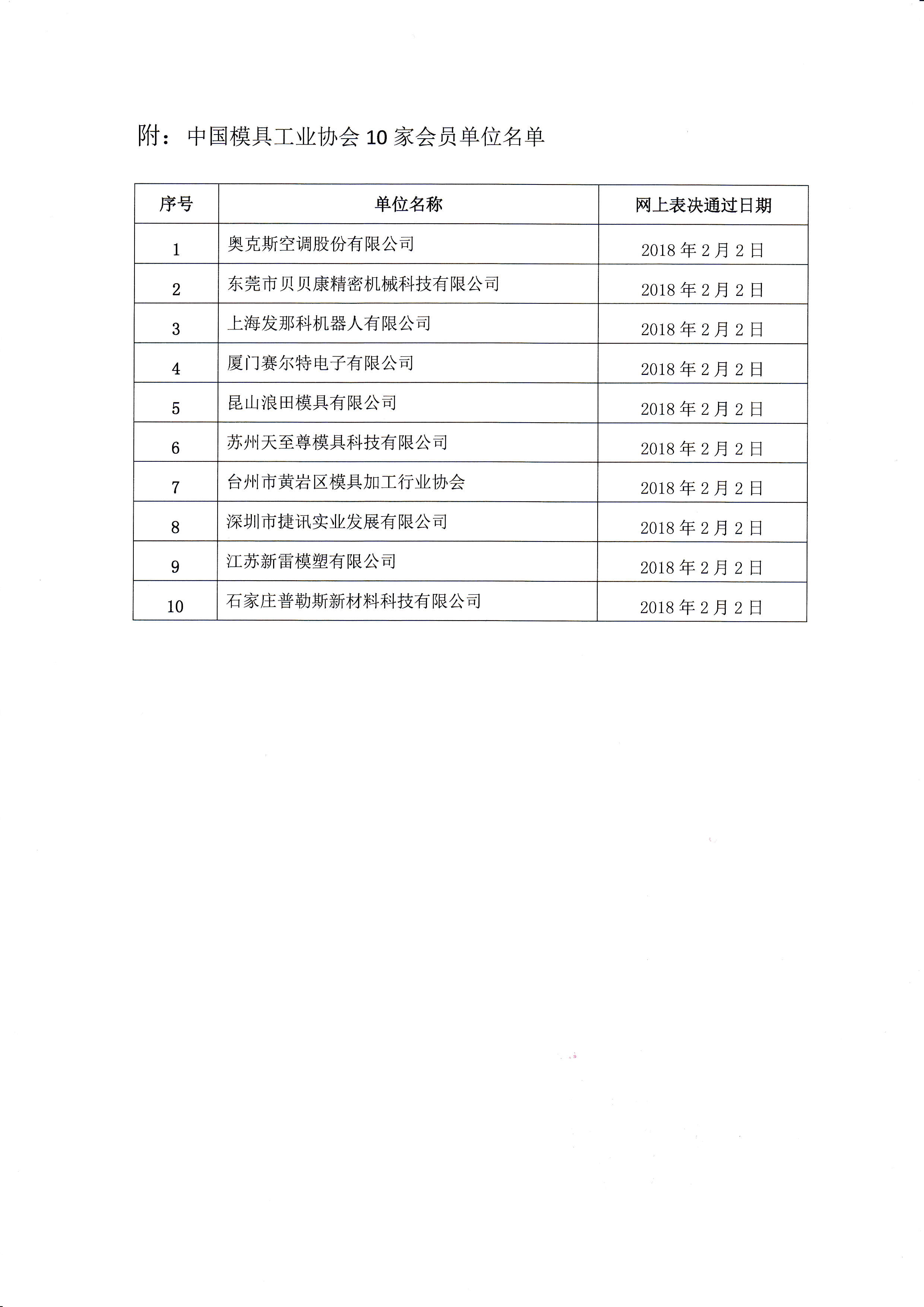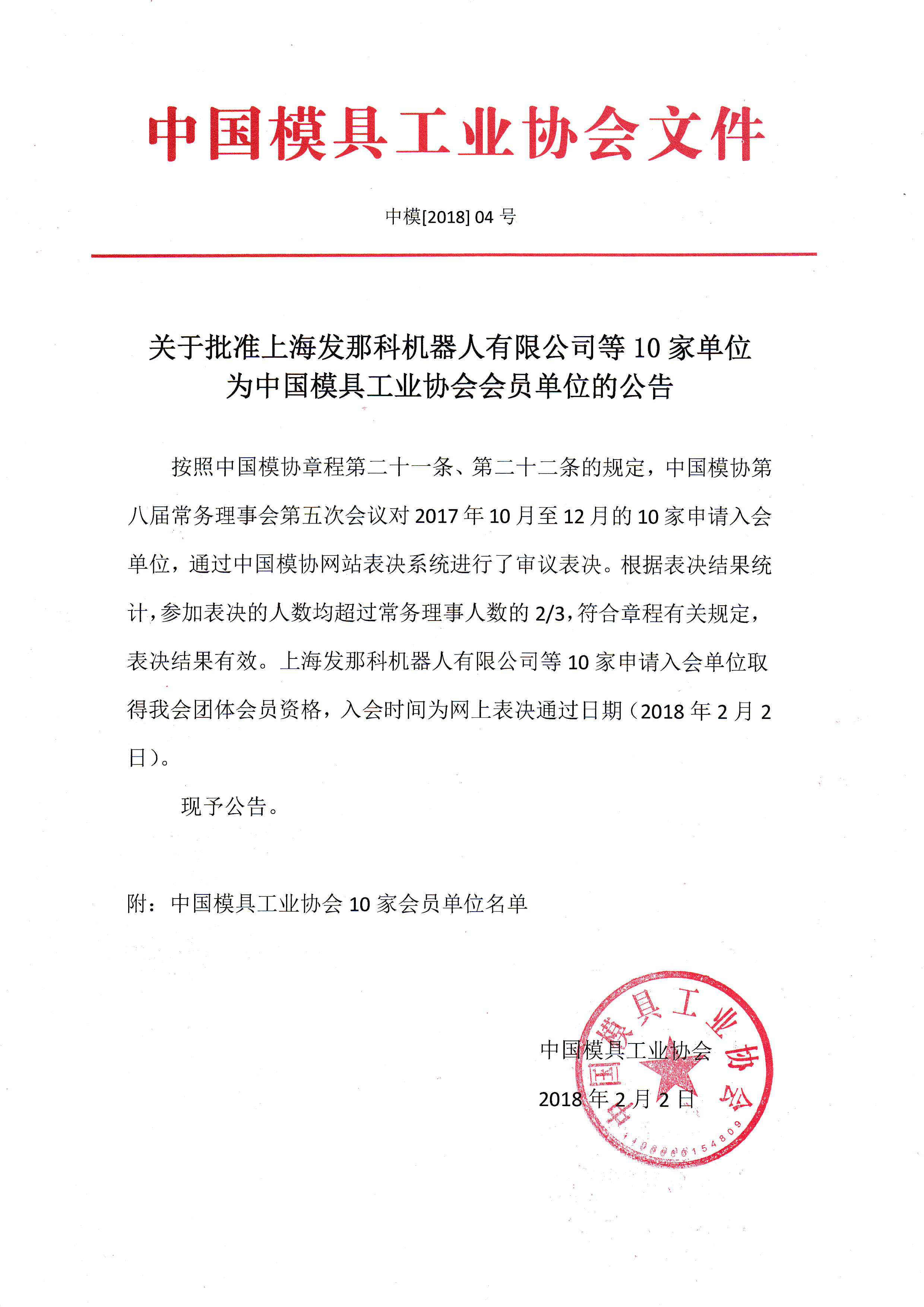 關(guān)于批準(zhǔn)上海發(fā)那科機(jī)器人有限公司等10家單位為中國模具工業(yè)協(xié)會(huì)會(huì)員單位的公告