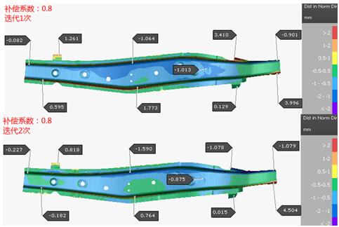 再次嘗試進行補償系數為0.8的補償,其補償后的回彈結果如圖10所示,由回彈補償的結果可知,兩次迭代的補償效果均比補償系數為1的效果好,但是零件的法蘭區域的回彈還是較大,還需要改善。再嘗試用補償系數為0.9、1.1和1.2來進行補償,補償效果均不如補償系數為0.8的,所以最終確定選用0.8作為最佳的補償系數來進行其它方案的補償