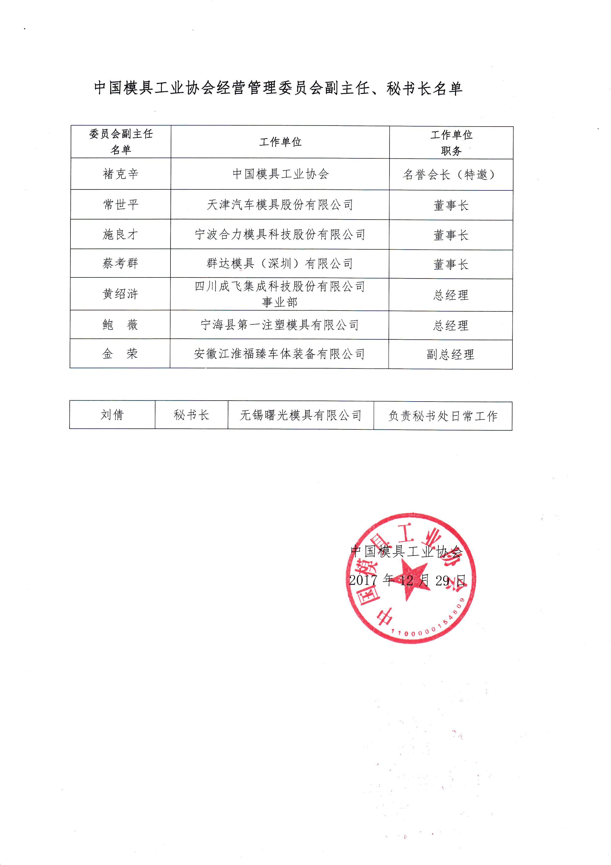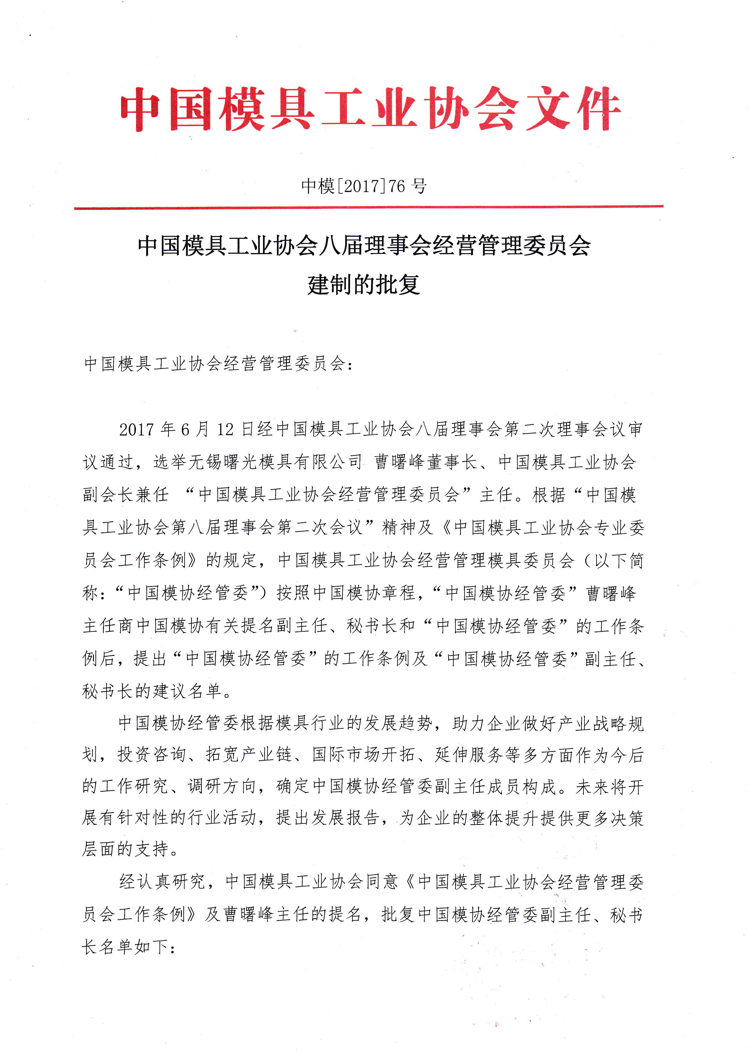 中國模具工業(yè)協(xié)會八屆理事會經(jīng)營管理委員會建制的批復(fù)