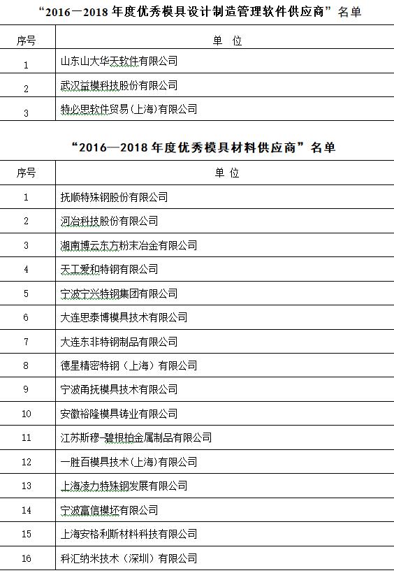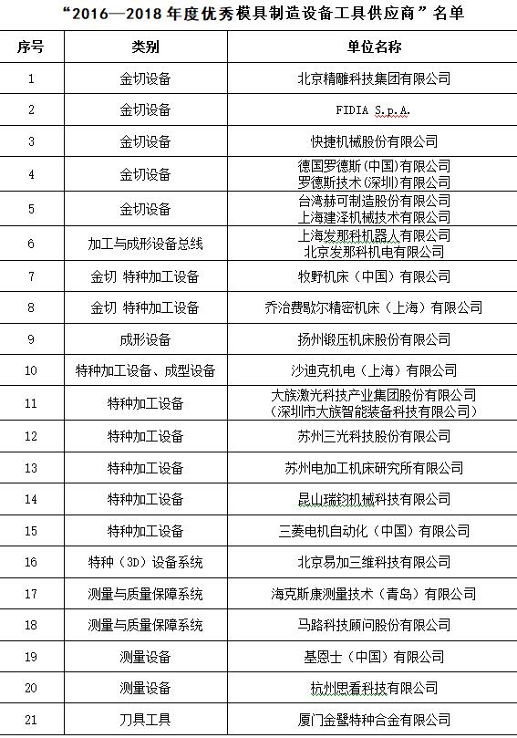 在知名品牌專業展會——中國國際模具技術和設備展覽會DMC上開展優秀供應商的評選活動,得到了各行業的廣泛認可,被評定為優秀供應商的企業,將在模具企業的采購中獲得優先推薦資格并在行業里得到廣泛的宣傳推廣,并在中國模協的官網上進行公告,至今已成定式。DMC2018期間,中國模具工業協會委托中國模協裝備委員會、數字化信息化委員會、材料委員會,本著自愿的原則,依據供應商的技術水平、在模具行業的服務能力、市場占有率的高低、模具行業服務滿意度等行業貢獻指標,并結合模具企業的意見,最終評選出21家“2016—2018年度優秀模具制造設備工具供應商”、3家“2016—2018年度優秀模具設計制造管理軟件供應商”、16家“2016—2018年度優秀模具材料供應商”(同時見m.zhrjk.cn,diemouldchina.com.cn),具體名單如下所示,排名均不分先后。