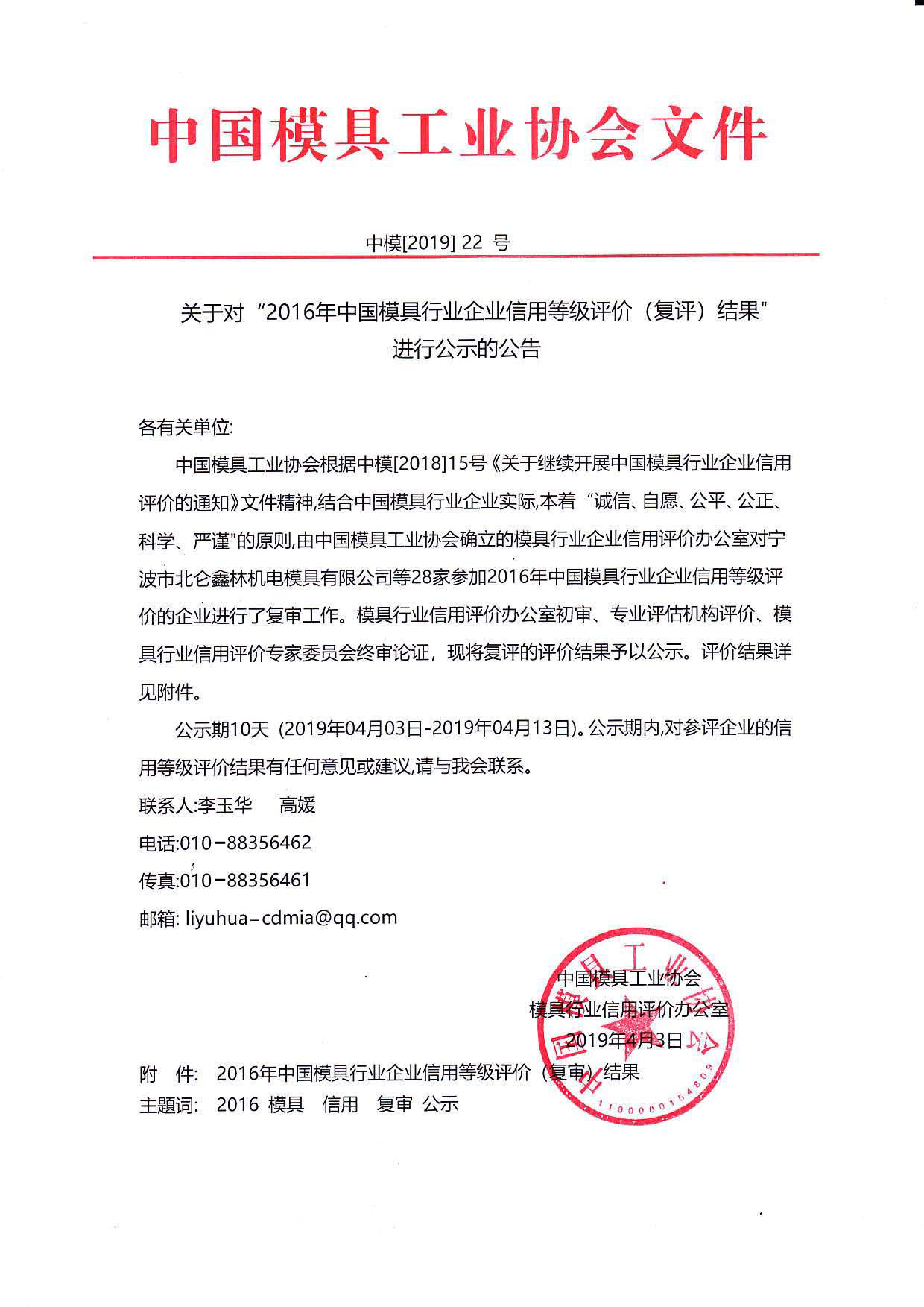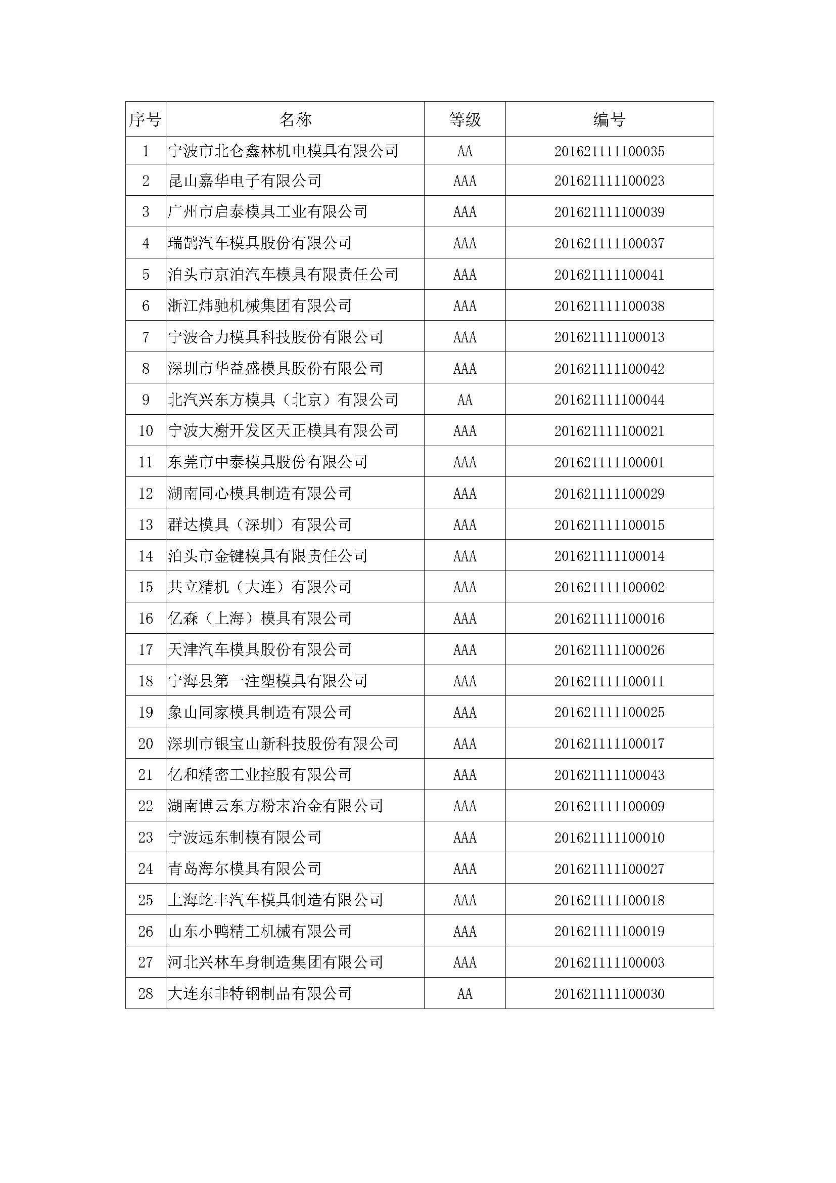 關(guān)于對“2016年中國模具行業(yè)企業(yè)信用等級評價(復(fù)評)結(jié)果”進行公示的公告