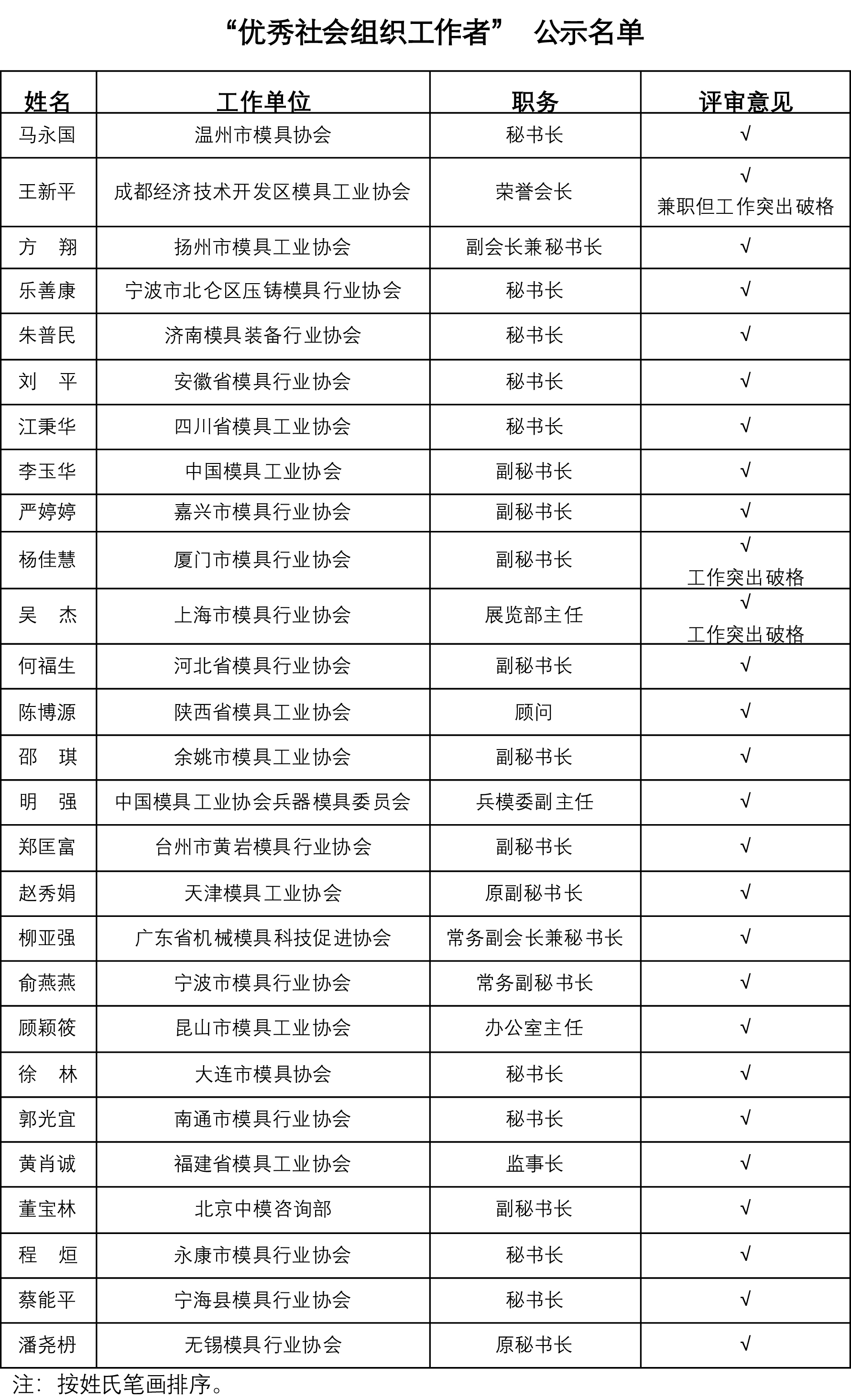 依據“優秀社會組織工作者”評選方案,中國模協在模具行業協(學)會中開展“優秀社會組織工作者”評選活動。按照程序,各地方協(學)會,根據 “優秀社會組織工作者”推薦條件,推薦本地區的候選人名單;按“優秀社會組織工作者”評選辦法,中國模協秘書處對候選人材料進行初審、匯總,由中國模協常務理事、理事中產生的評選工作組評選;由中國模協駐會會長、部分副會長、秘書長、常務理事代表組成的評選領導小組核準確認。經過充分評選,確定的27 名“優秀社會組織工作者” 評選結果,在中國模具工業協會官網公示如下,公示期2019年11月8日-14日。