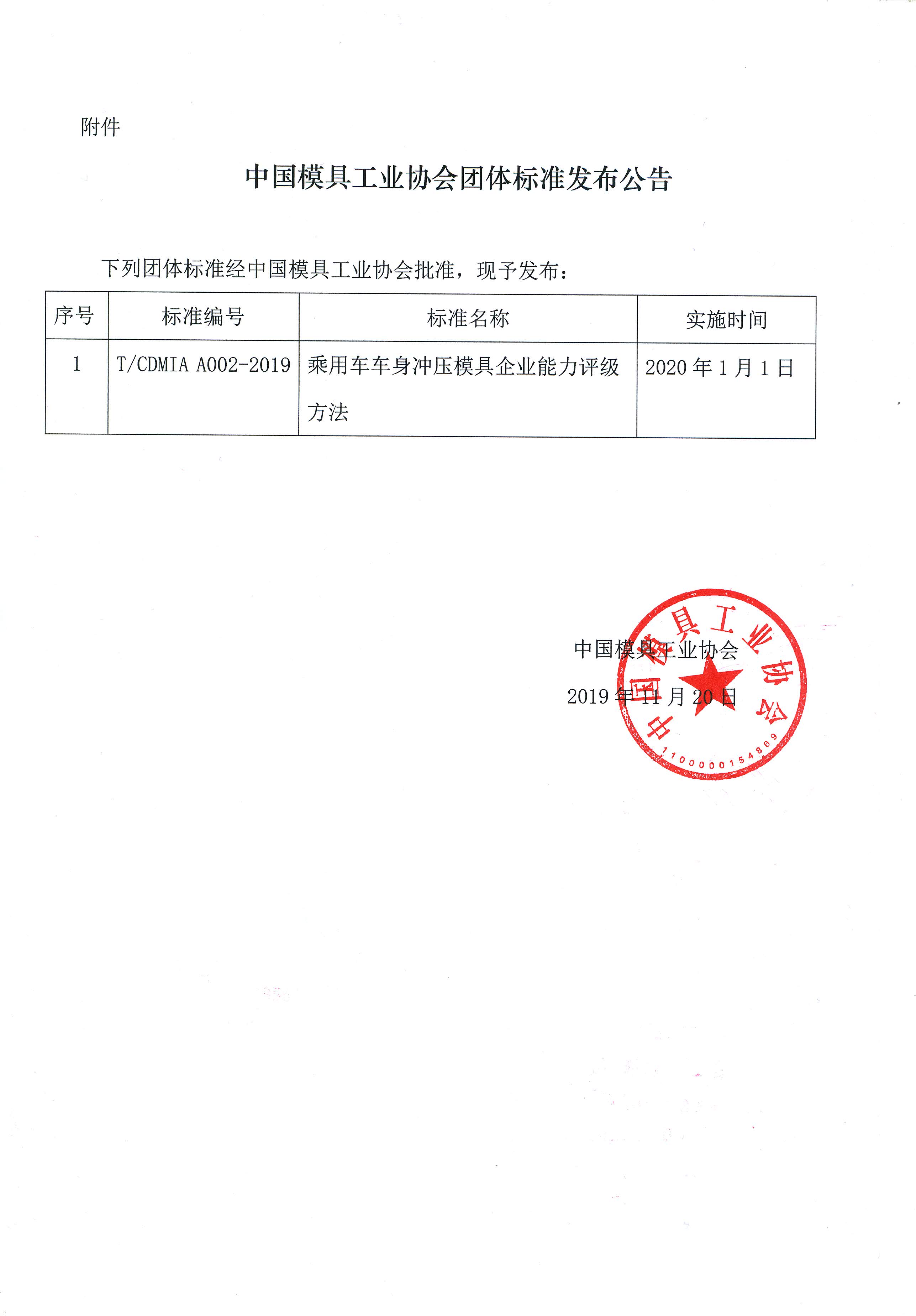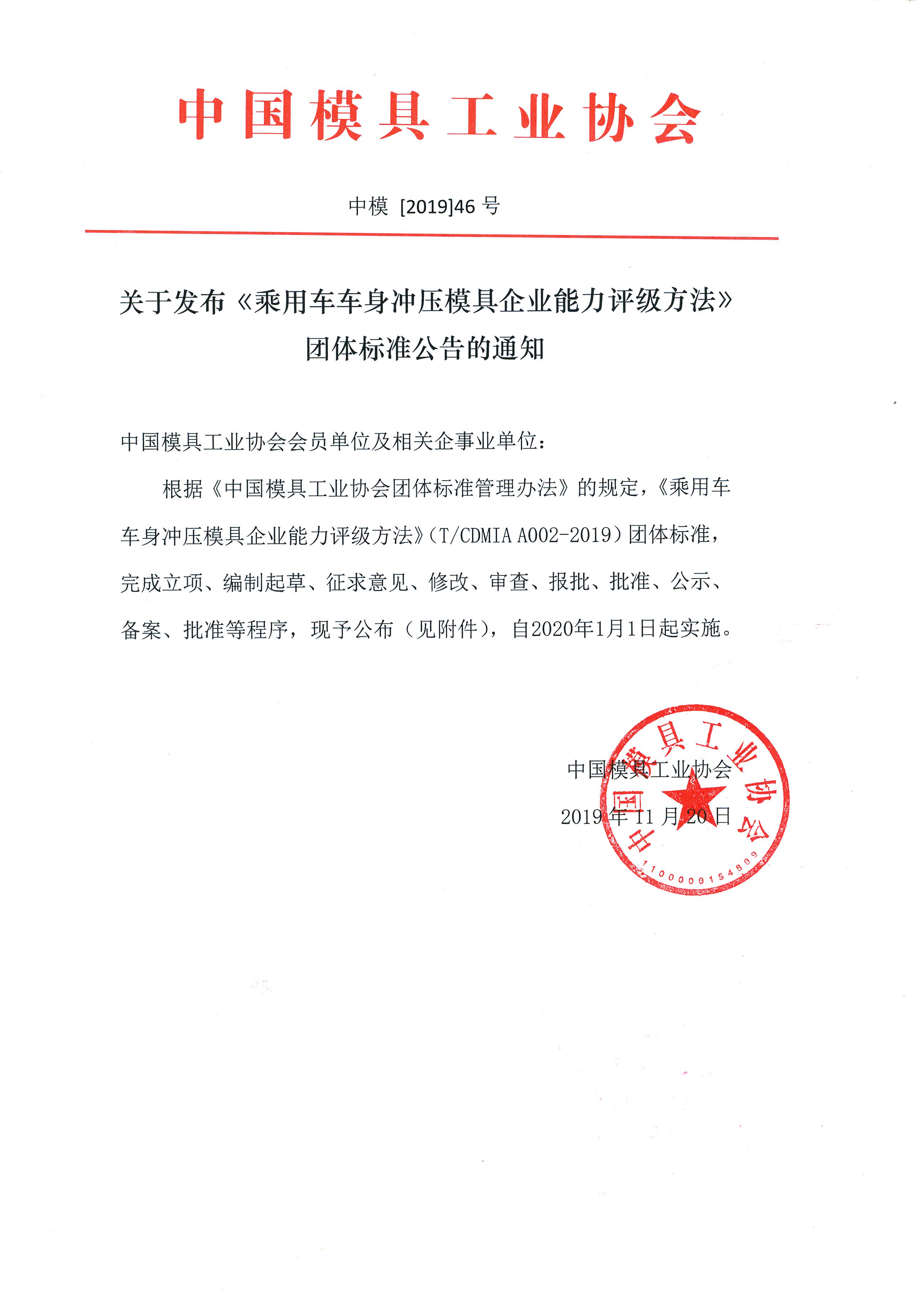 關(guān)于發(fā)布《乘用車車身沖壓模具企業(yè)能力評級方法》團(tuán)體標(biāo)準(zhǔn)公告的通知