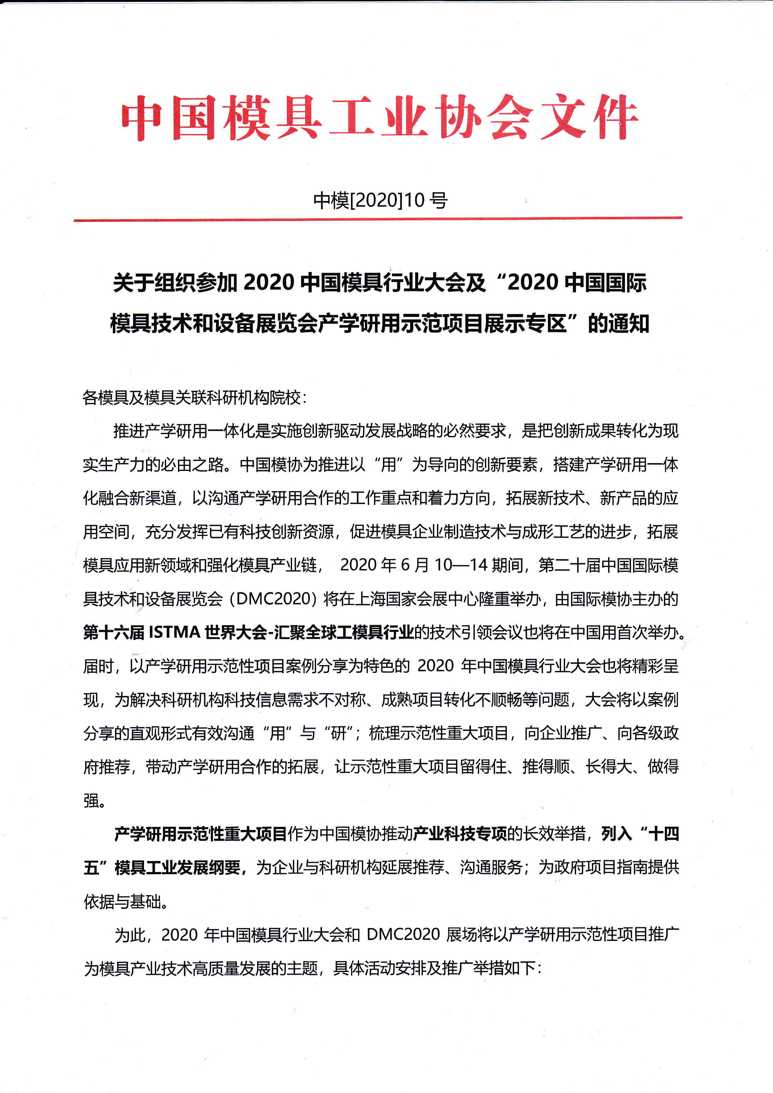 關(guān)于組織參加2020中國模具行業(yè)大會及“2020中國國際模具技術(shù)和設(shè)備展覽會產(chǎn)學研用示范項目展示專區(qū)”的通知
