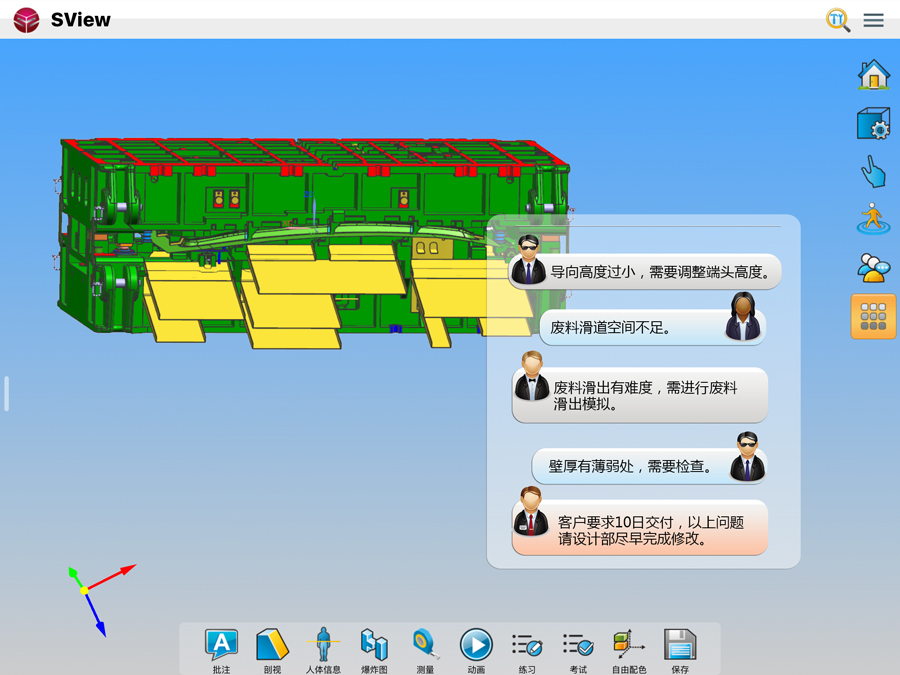 一個模具企業的新產品協同評審會議中,通過視頻、語音、文本交流對模具的零件表面缺陷、結構可靠性、工藝性進行分析,模具設計人員可以實時記錄各方評審意見,方便完善模具3D設計。最后在SView協同會議中還可以進行會簽,確認相應責任。