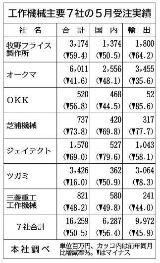 同一日,日本機床工業會(日工會)也公布了5月份的機床訂單實績(速報值)為512億6000萬日元,與去年同期相比減少了52.8%,連續20個月低于去年同期。隨著新型冠狀病毒疫情影響的擴大,客戶的設備投資紛紛擱置,營業活動也受到了自肅的影響,內需和外需都大幅下降。總額與外需都是2009年11月以來的最低水平。單月的總額也連續2個月低于600億日元。