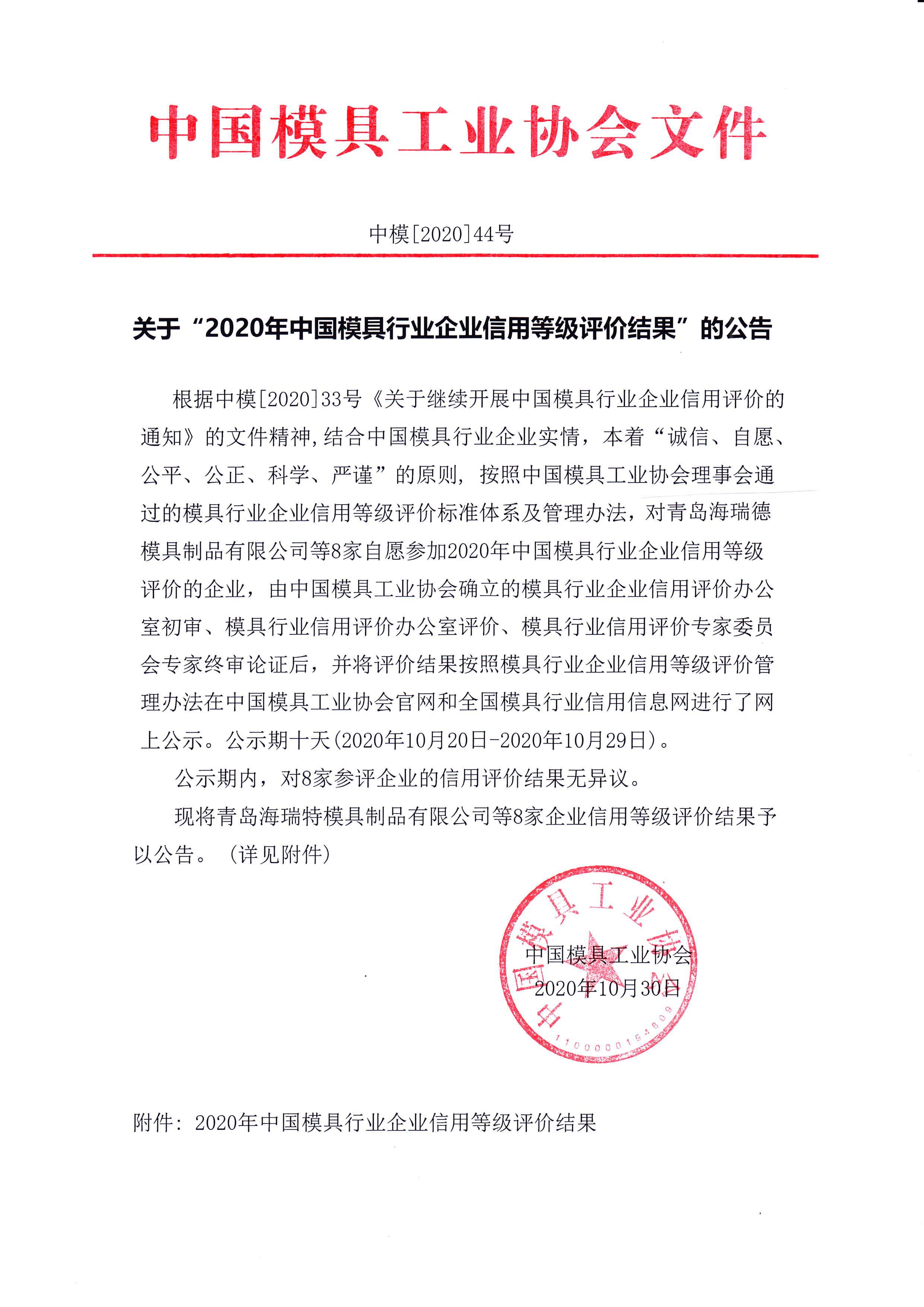 關(guān)于“2020年中國模具行業(yè)企業(yè)信用等級(jí)評(píng)價(jià)結(jié)果”的公告