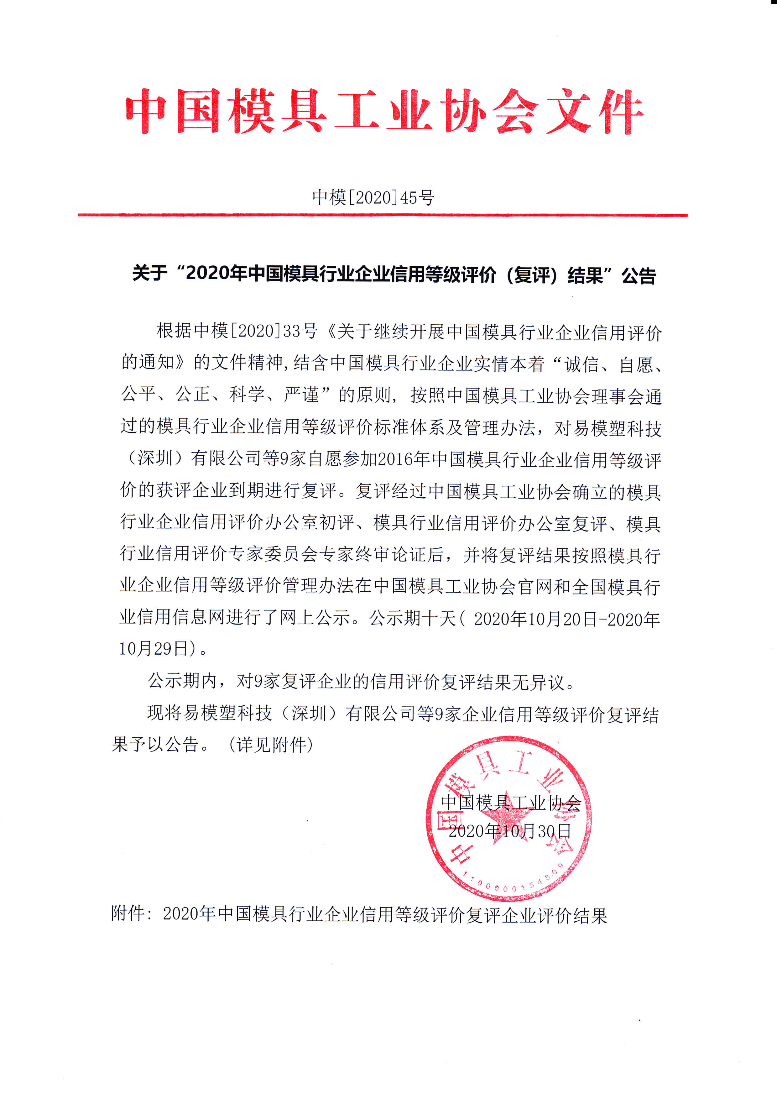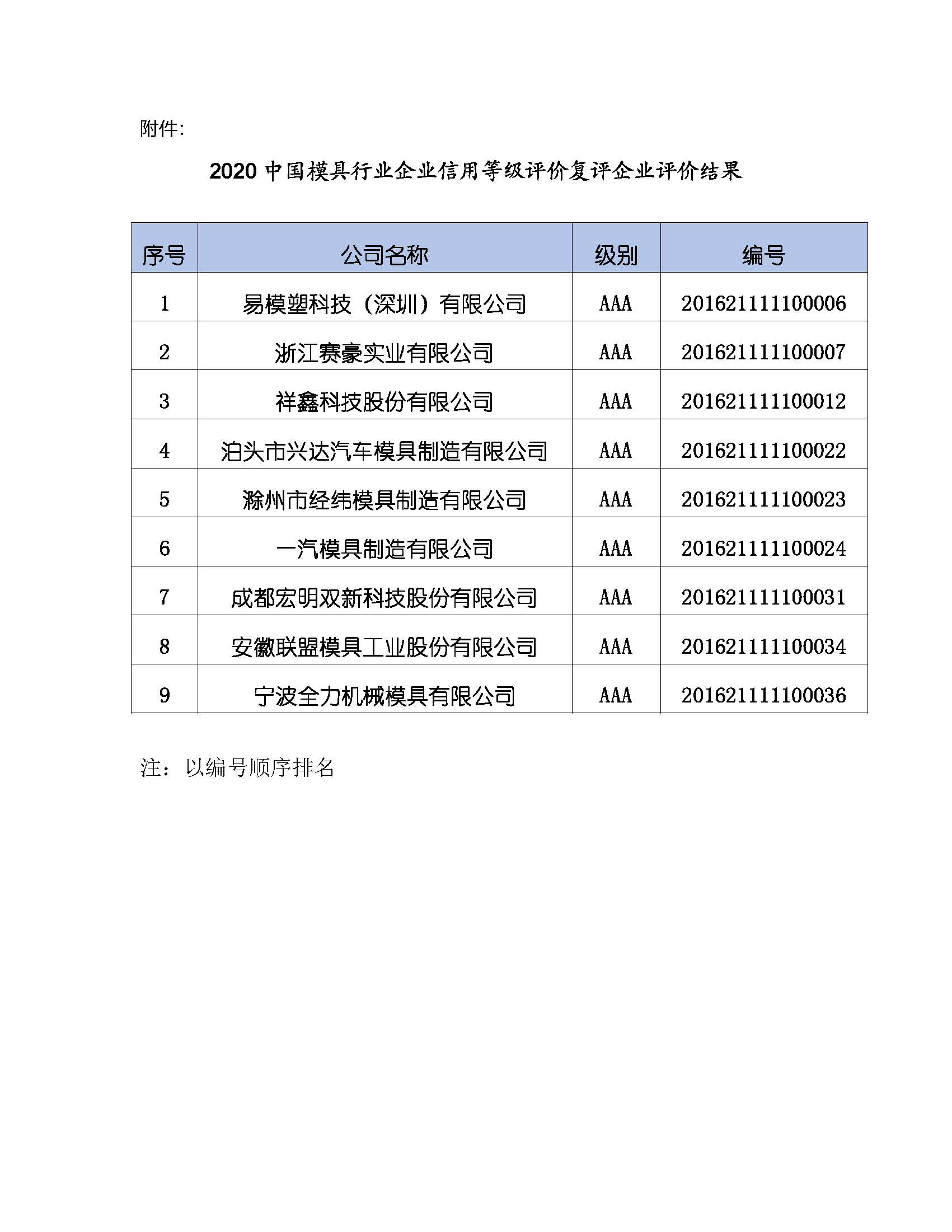 關于“2020年中國模具行業(yè)企業(yè)信用等級評價(復評)結(jié)果”公告