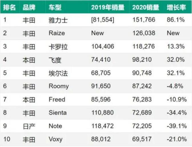 而在車型方面,雖然日本每年車型銷量排行榜單變化都很大,但2020年仍然是近年來變化最大的一次。銷量排名前10的車型沒有一款排名與前一年相同,而2019年的銷量冠軍豐田普銳斯更是跌出了榜單前十名,今年的銷量冠軍為去年排名第十位的豐田雅力士。細分車型方面,轎車和MPV仍是日本市場絕對主流,榜單前10中僅有豐田Raize一款SUV車型。