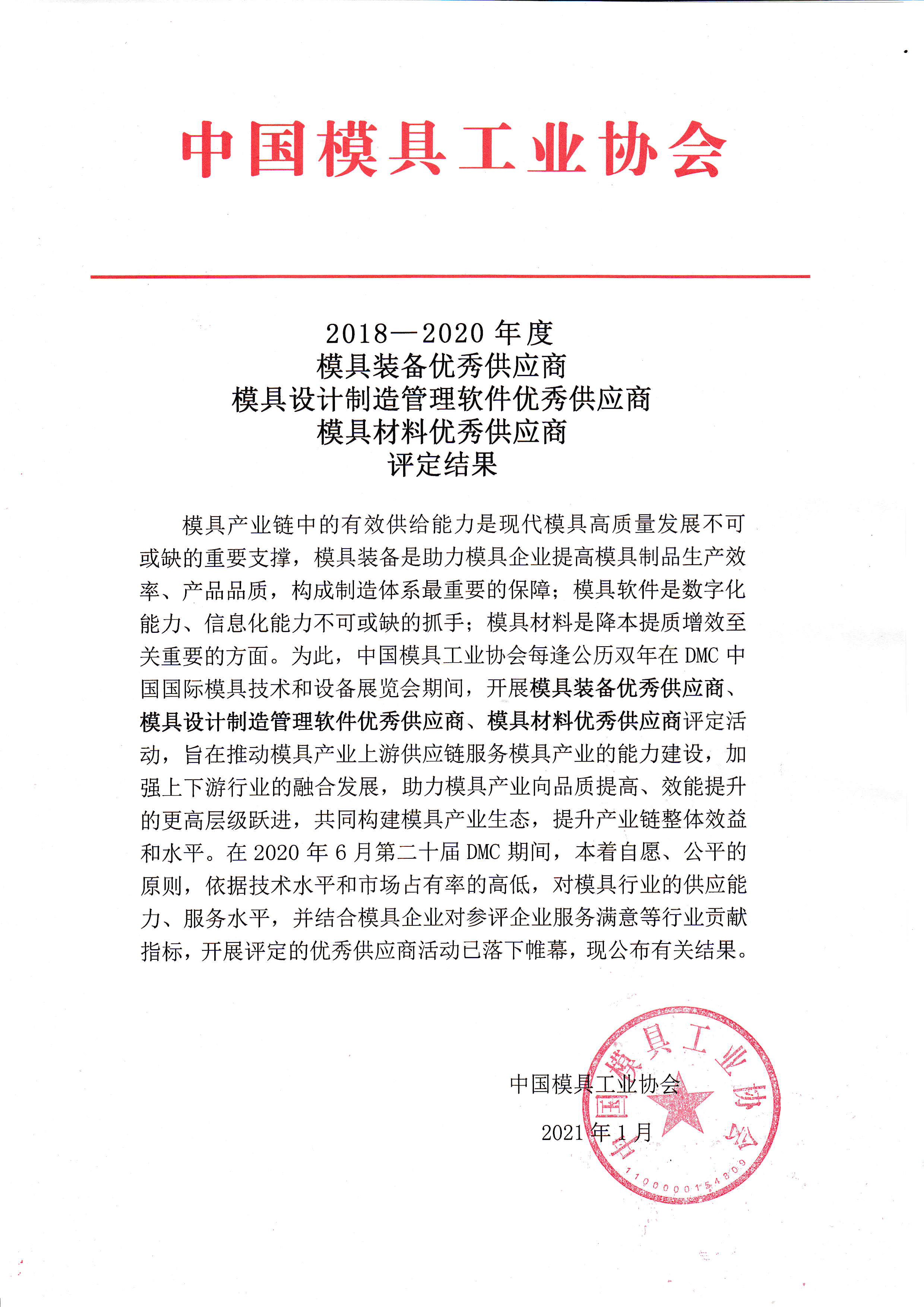 2018—2020年度 模具裝備優秀供應商 模具設計制造管理軟件優秀供應商 模具材料優秀供應商 評定結果