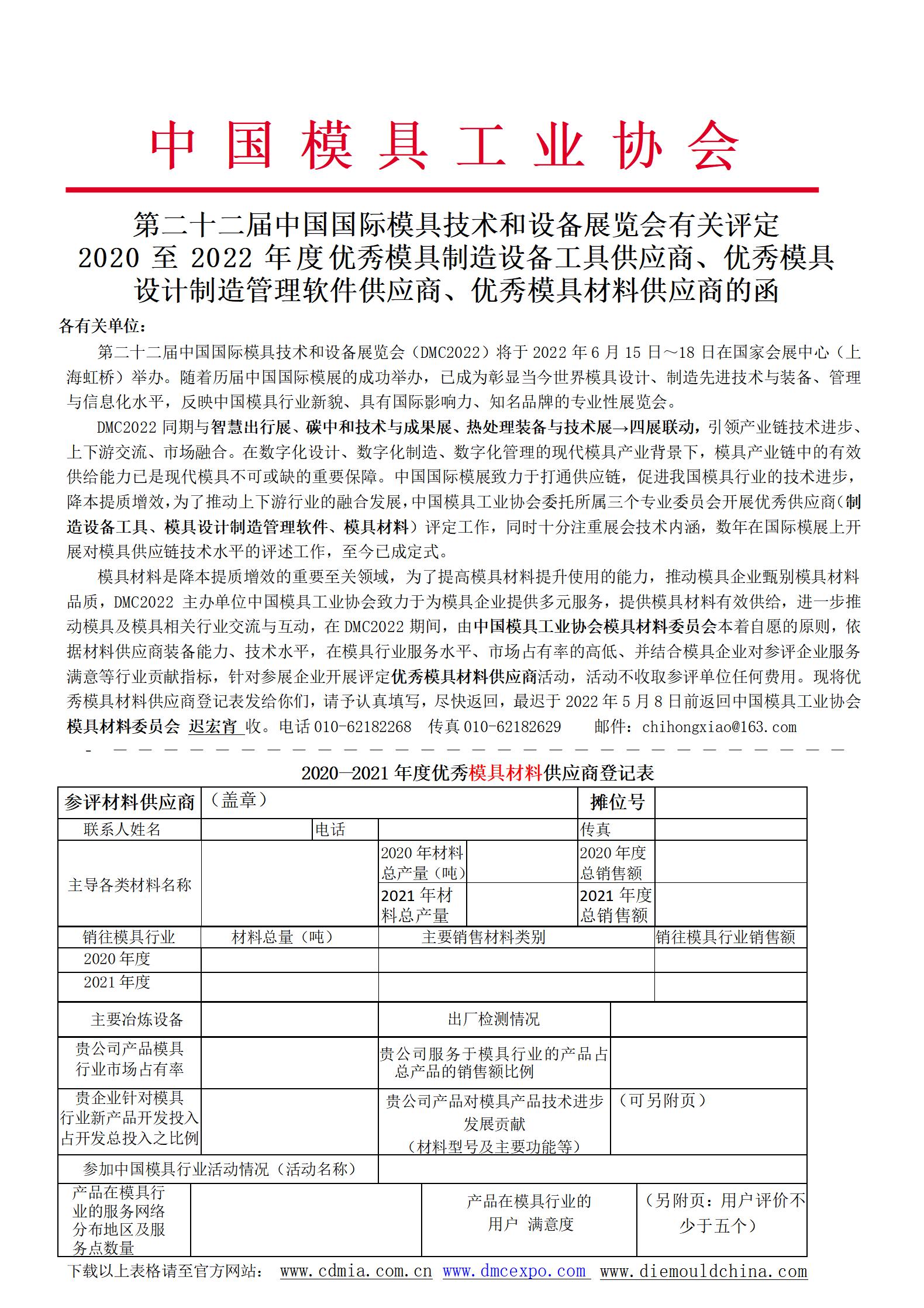第二十二屆中國國際模具技術和設備展覽會有關評定 2020至2022年度優秀模具制造設備工具供應商、優秀模具設計制造管理軟件供應商、優秀模具材料供應商的函