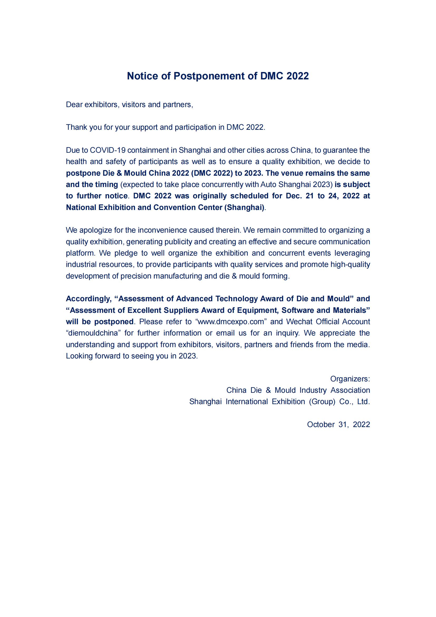 Notice of Postponement of DMC2022