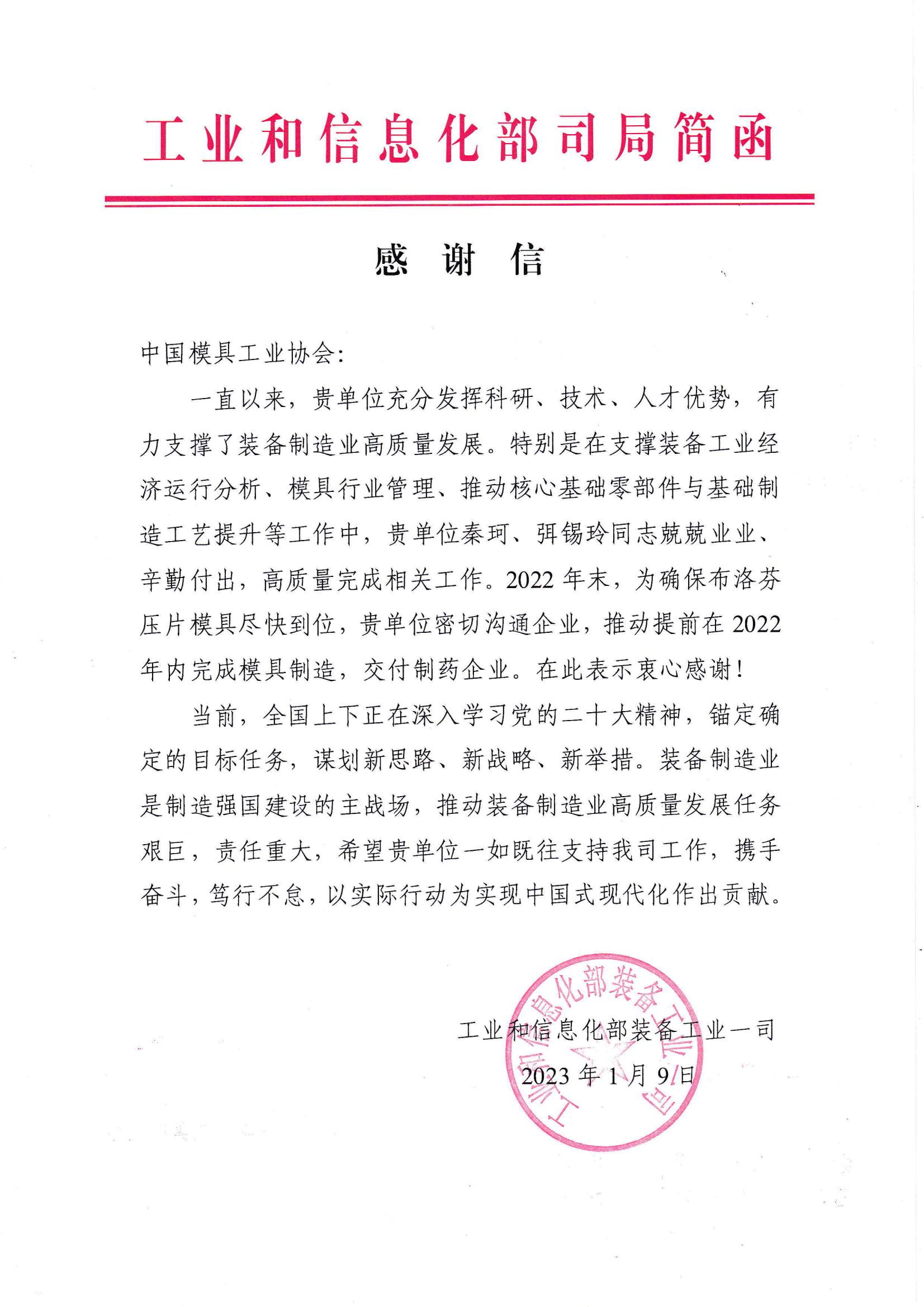 工信部裝備工業一司致中國模協感謝信