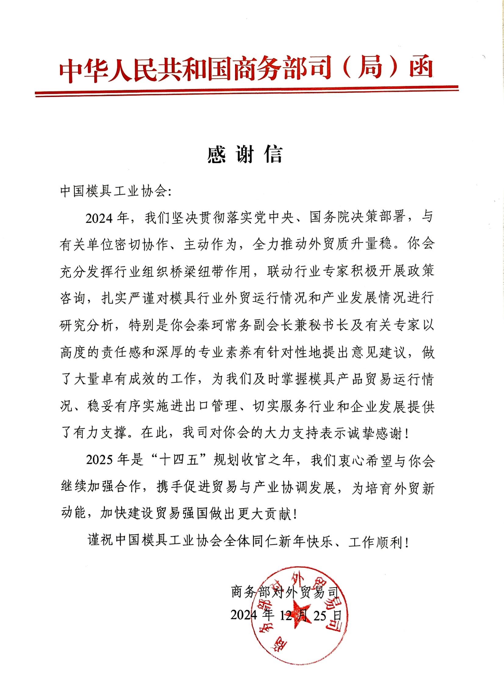 商務(wù)部對(duì)外貿(mào)易司感謝信