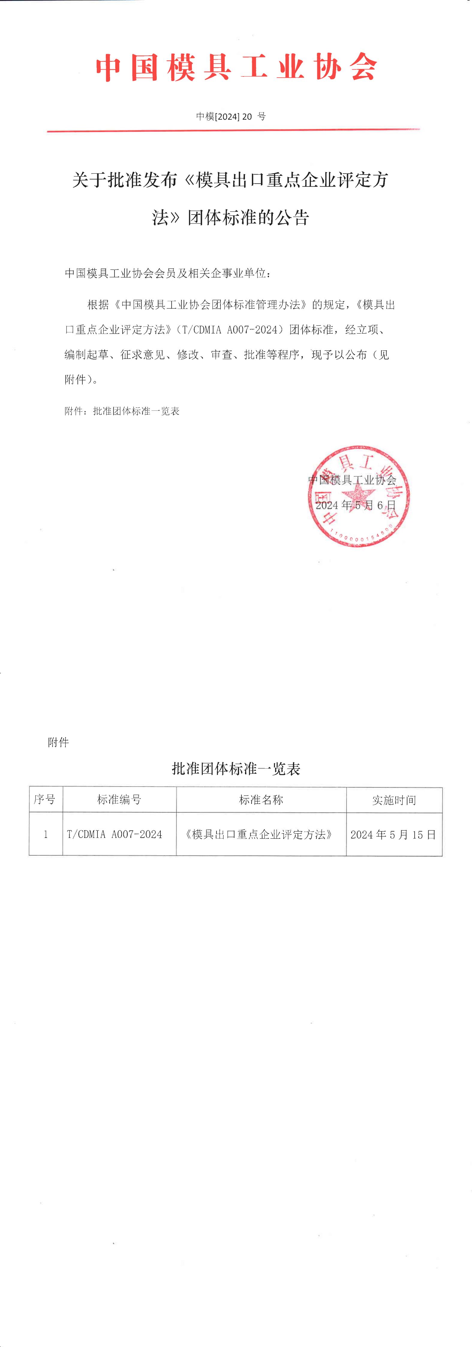 關(guān)于批準(zhǔn)發(fā)布《模具出口重點企業(yè)評定方法》團(tuán)體標(biāo)準(zhǔn)的公告